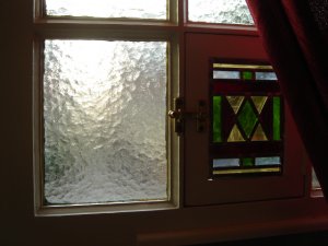 In een bestaand wc-raam is een glas-in-lood raam gemaakt, gelijk aan de ramen bij andere huizen in de straat.