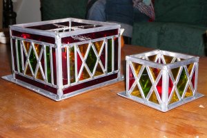 Een drieluik van glas-in-lood ramen, elk 40 x 50 cm. Met de klant is het ontwerp gemaakt en zijn de kleuren uitgezocht. In het buitenste lood (omtrek) is staal aangebracht waarvan tevens de ophanghaakjes zijn "gedraaid".