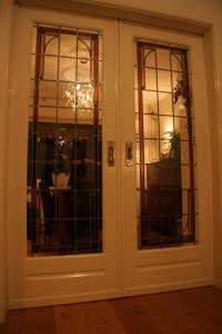 Een bestaande glas-in-lood deur moest aangepast worden zodat het bij andere (en suite) deuren met een patroon zou passen. Het paneel is daarom uit elkaar gehaald en het patroon uit de andere deuren is doorgevoerd in het nieuwe paneel.