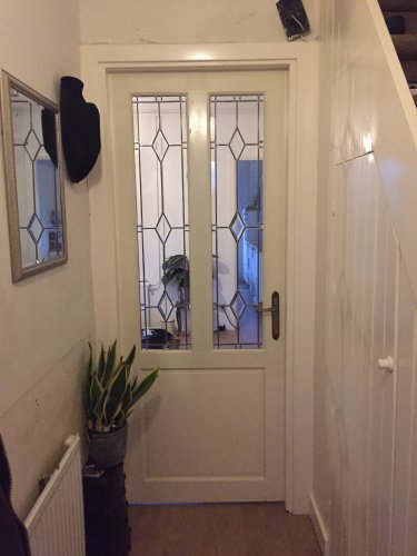 Een bestaande binnendeur is aangepast zodat er twee glas-in-lood panelen in geplaatst kunnen worden. Het oude glas is verwijderd en we hebben er een nieuwe middenstijl in gemaakt.