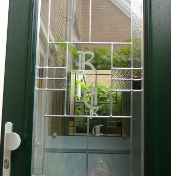 De initialen van de bewoners staan in het glas-in-lood raam. De initialen zijn met behulp van een mal met speciale etsch crème opgebracht, dit heeft een gezandstraald effect. Het glas-in-lood raam is vervolgens in isolatieglas geplaatst.