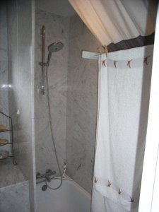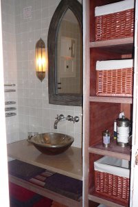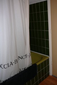 In de muur bij het bad zijn nisjes gemaakt voor flesje e.d..