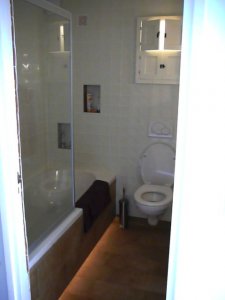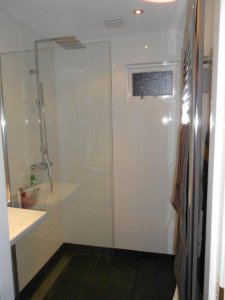 Na de verbouwing zit het bad links (toilet zit op dezelfde plaats). Onder het bad is verlichting geplaatst waardoor het bad lijkt te zweven en de ruimte groter lijkt.