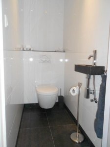 Ook in het toilet is gebruik gemaakt van de opstaande tegelrand op de vloer.